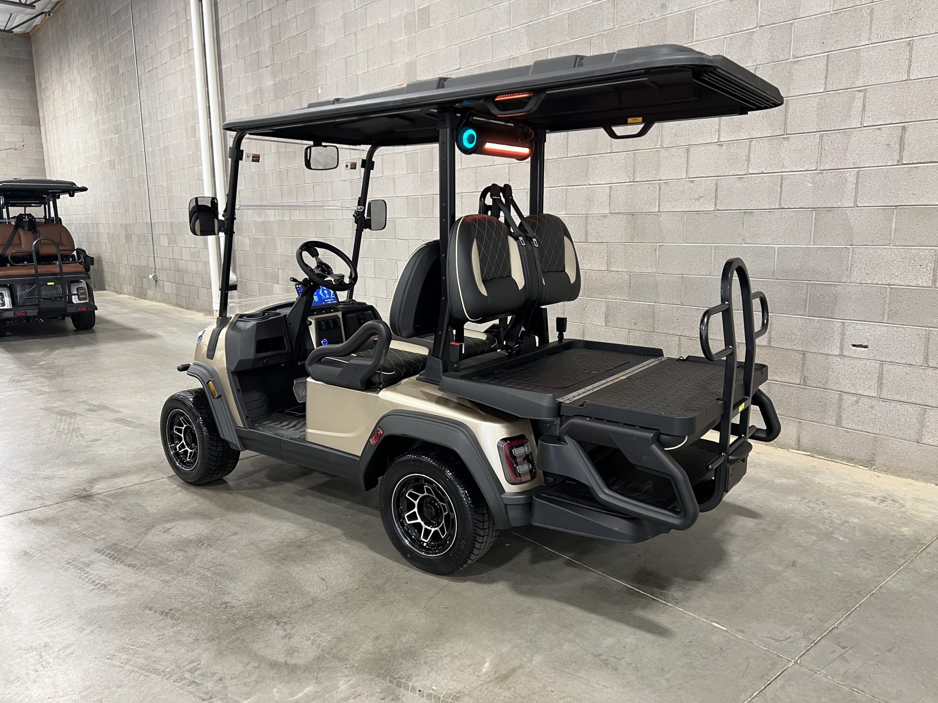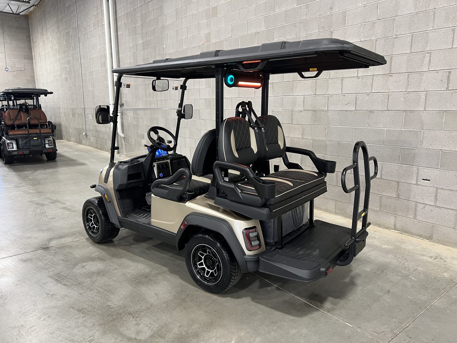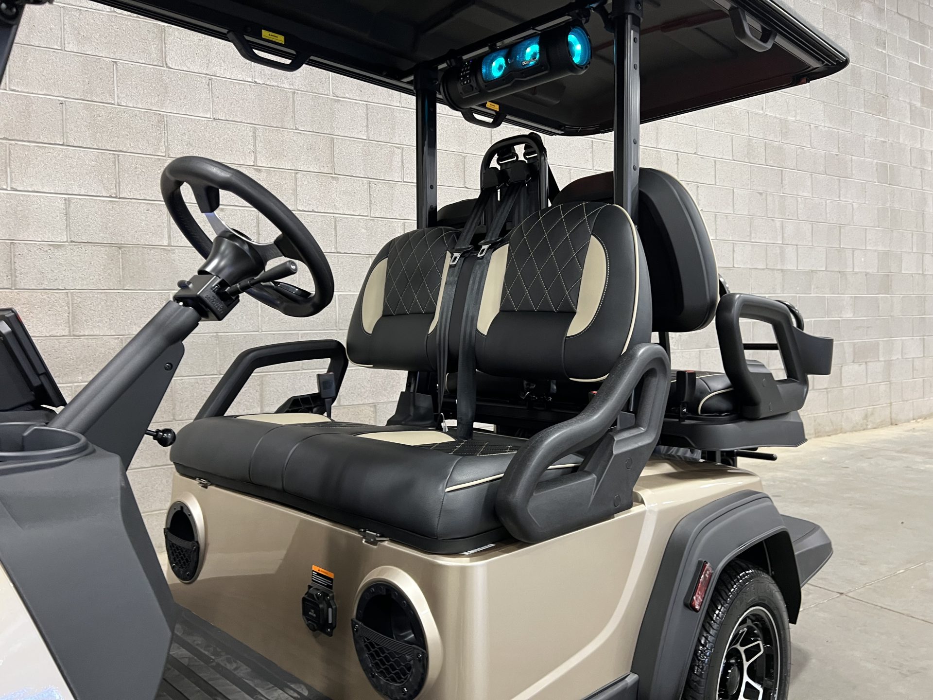 The golf cart also features a built-in Bluetooth sound system, so you can enjoy your favorite tunes as you roll along. Safety is a priority with integrated seat belts, a sturdy roll cage, and reliable brakes, offering peace of mind for you and your passengers.