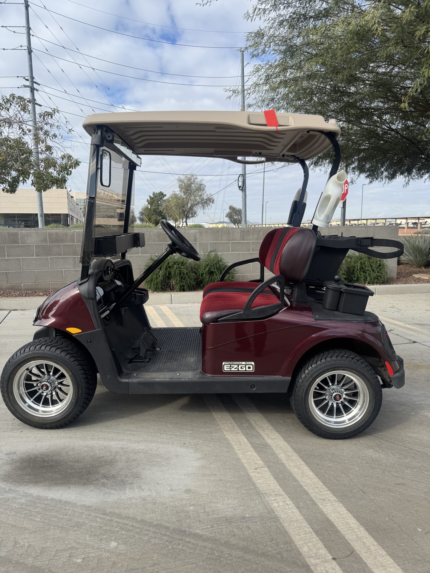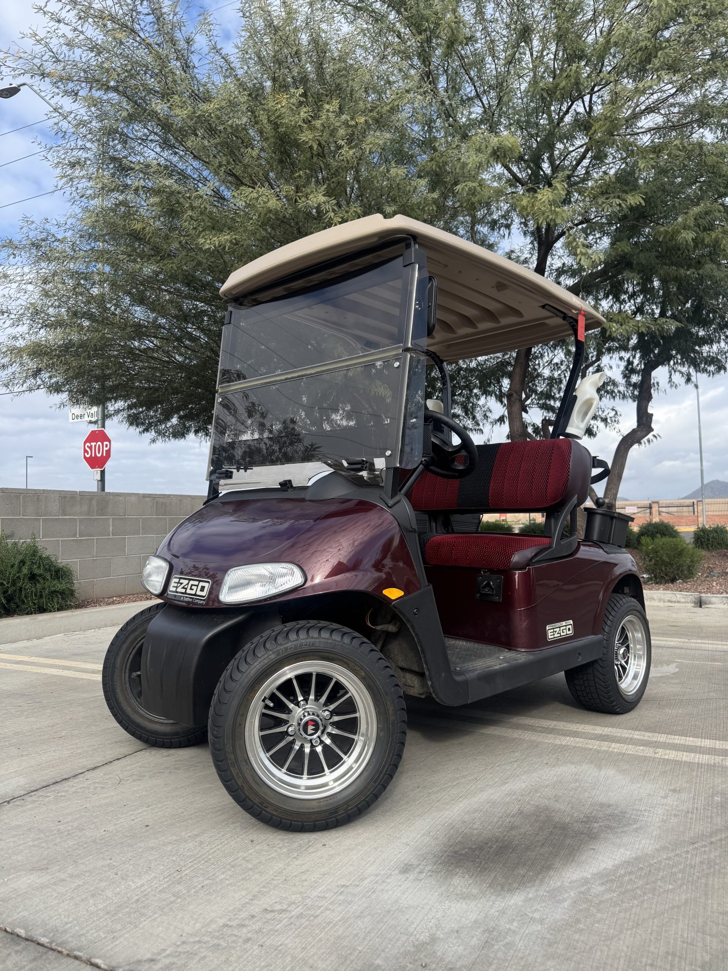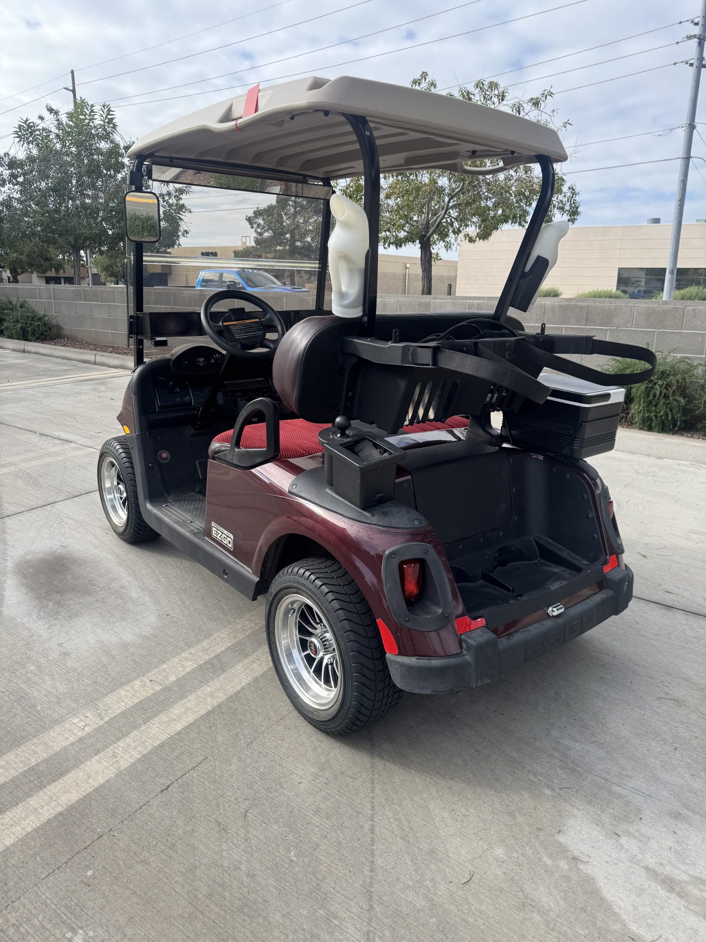 Extras include a built-in cooler, sand bottle, ball washer, and rear golf bag attachment. A tinted windshield adds style while reducing glare and sun exposure. This EZGO is a reliable, modern golf cart with great upgrades and functionality.