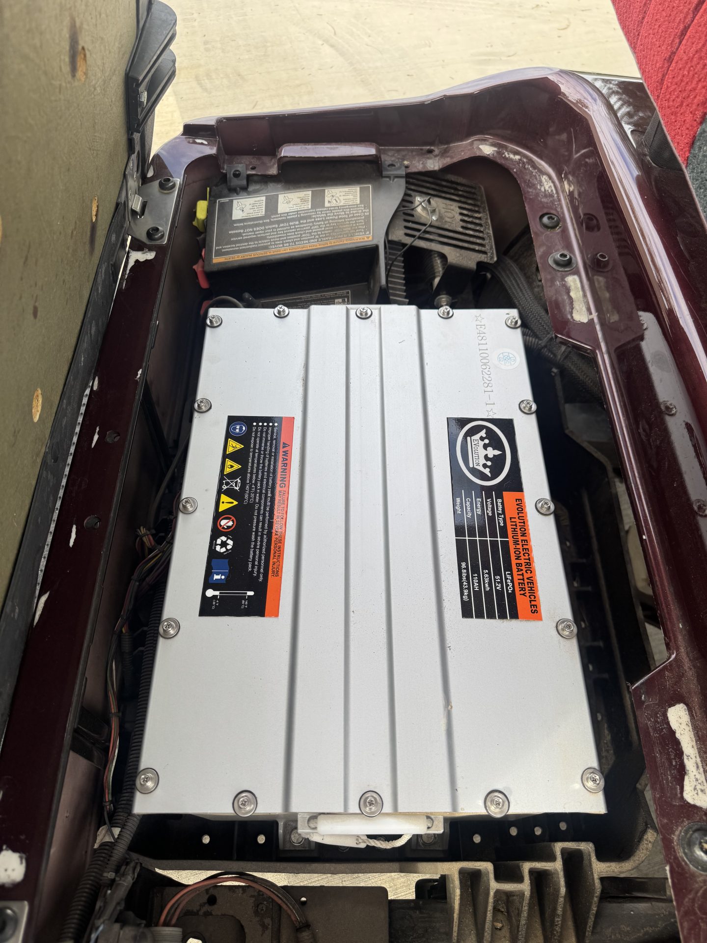 This 2013 EZGO golf cart is upgraded with a brand new Evolution lithium battery, offering long life, fast charging, and low maintenance. It features aftermarket wheels and tires that give it a sharp look and smooth ride. The cart includes comfortable fabric seats and is well equipped for the course or everyday use.